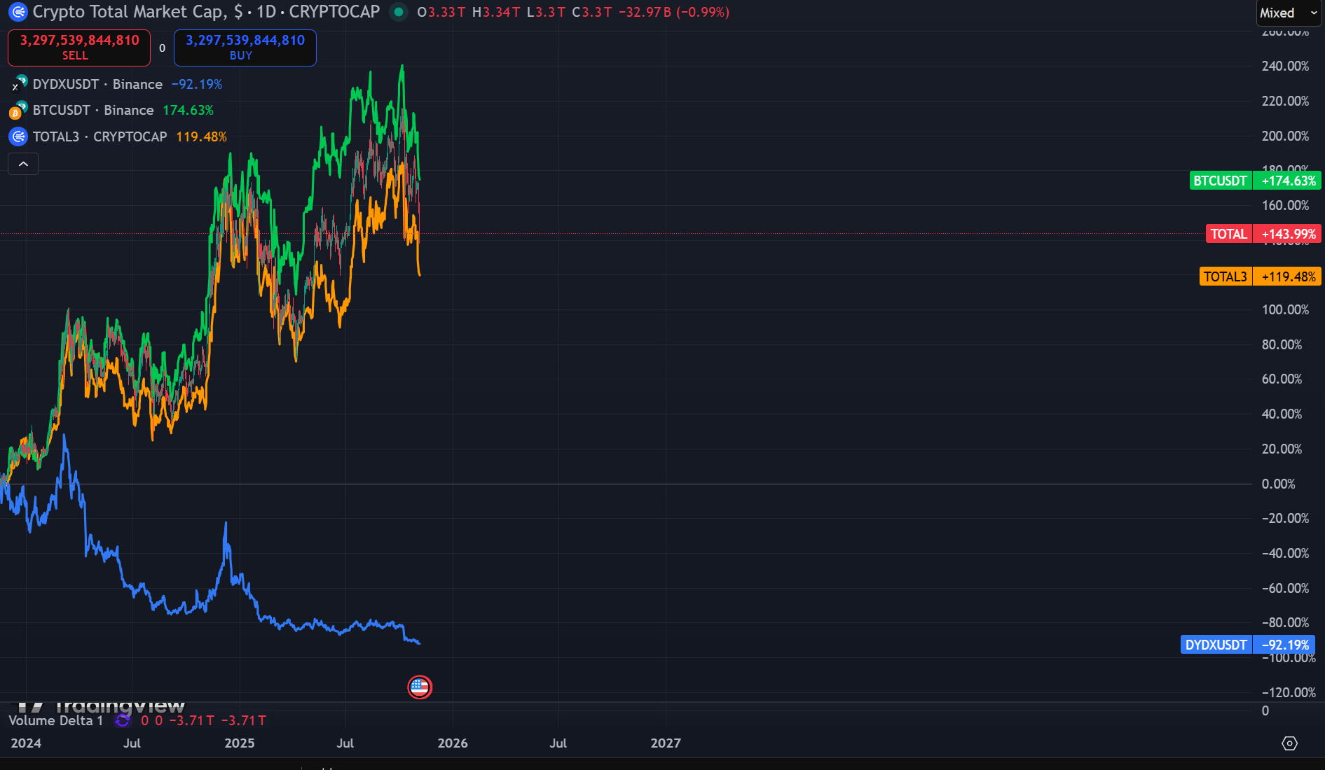 You need to understand that the users of dYdX v4 are perp traders and they don’t need any DYDX to trade, only USDC. DYDX used to be a governance token, and now a staking token to secure the network and get real yield. Better graph to look at is the perp trading volume, this is what is important, with high trading volume dYdX has long term future, otherwise if no trading volume it is irrelevant any discussion about the token
