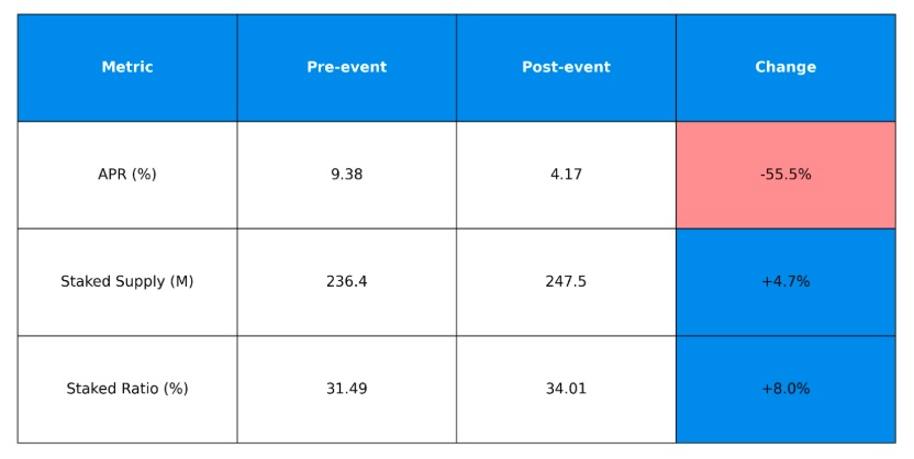 - Despite cutting staking yield from 9.38% to 4.17% by reducing staker revenue allocation from 100% to 40%, staking participation rose from 31.49% to 34.01% of total supply in two months.