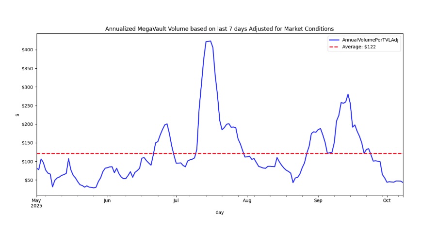We look historically at how much volume is generated per of TVL in the Megavault. Excluding some brief spikes at the launch of the Megavault and in March 2025, the annualized volume/ TVL in the vault has remained under $200 p.a.