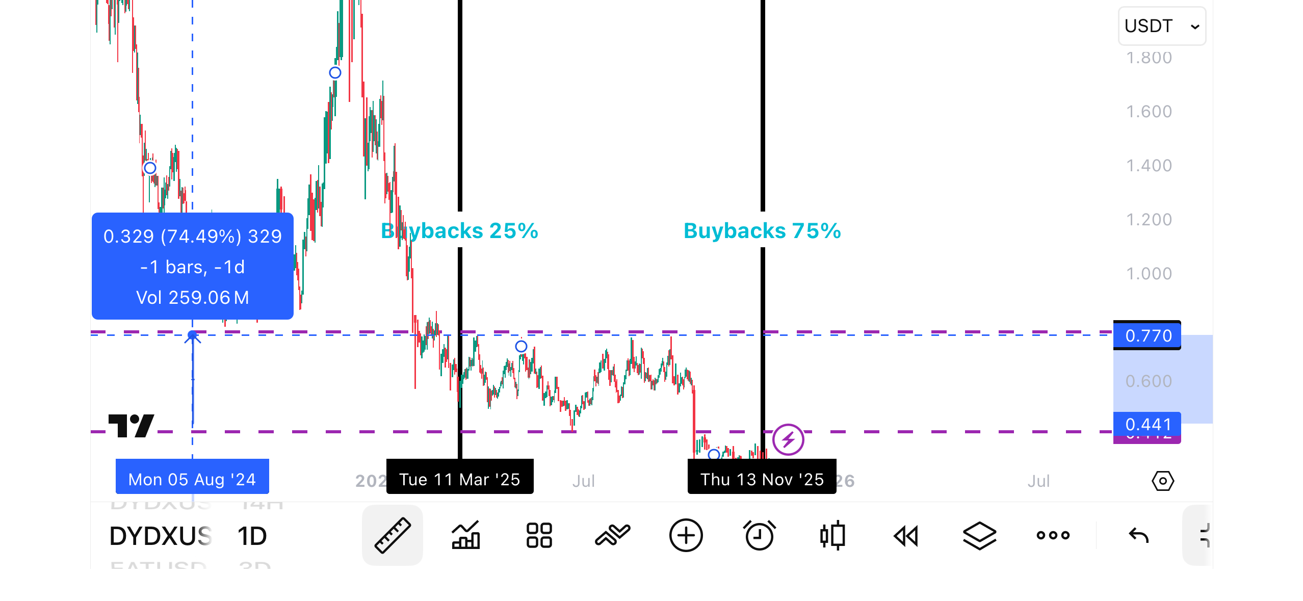 DYDX still suffers from circular supply coming from trader rewards and scheduled unlocks (ending in early summer of 2026). These flows reduce the positive impact of any buybacks. At the same time, DYDX Chain depends on having enough tokens staked because its security model is built on it.