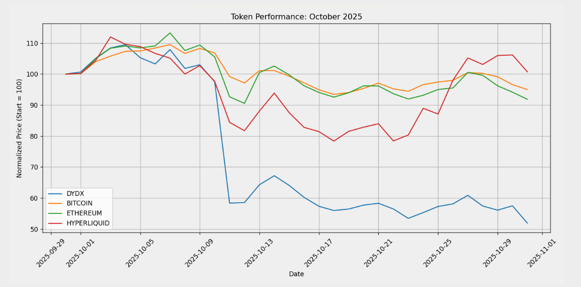 DYDX underperformed majors through October, with the token declining sharply after the 10–11 October deleveraging event and stabilising at materially lower levels for the remainder of the month. Relative performance remained weak compared with BTC, ETH, and HYPE, all of which retraced but recovered more of their early-month losses.