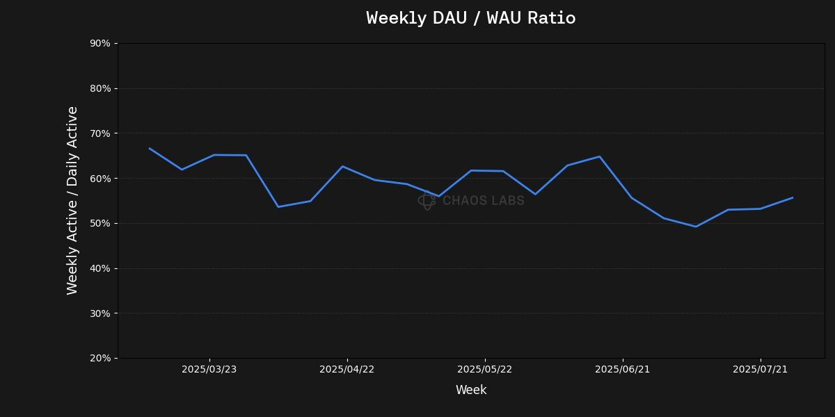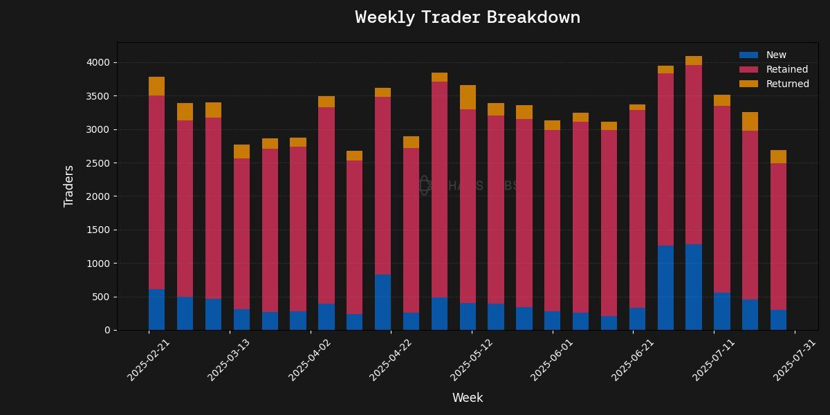 The weekly trader retention rate showed a clear increase in new trader participation throughout Season 4, especially during early July. This influx helped sustain elevated overall activity levels, with a strong base of retained traders remaining consistent week over week.